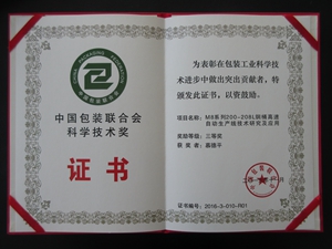 2016年11月我司M8系列200-208L鋼桶高速自動生產(chǎn)線榮獲中國包裝聯(lián)合會科學(xué)技術(shù)獎;由于在中國制桶行業(yè)的突出貢獻(xiàn),我司董事長慕德平先生,榮獲中國包裝聯(lián)合會科學(xué)技術(shù)獎個人獎。