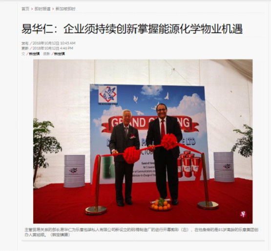 新加坡貿(mào)易關(guān)系部長(zhǎng)易華仁先生主持開幕式時(shí)指出,工廠的開設(shè)顯示新加坡能源與化學(xué)領(lǐng)域仍持續(xù)增長(zhǎng)。該領(lǐng)域是新加坡經(jīng)濟(jì)的主要支柱,占新加坡制造業(yè)產(chǎn)值的四分之一,聘請(qǐng)約二萬八千名員工。易華仁部長(zhǎng)對(duì)樂意包裝的新工廠是以提高生產(chǎn)力為首要任務(wù)感到欣慰。在城市化與經(jīng)濟(jì)增長(zhǎng)的推動(dòng)下,亞洲地區(qū)對(duì)能源和化學(xué)物品的需求快速增長(zhǎng)。新加坡基于地理位置和完備的化學(xué)供應(yīng)鏈,將能夠掌握在這個(gè)領(lǐng)域的機(jī)會(huì),但要確保本地企業(yè)繼續(xù)提供創(chuàng)新方案與維持環(huán)球競(jìng)爭(zhēng)力。易華仁部長(zhǎng)強(qiáng)調(diào),提高生產(chǎn)力是維持市場(chǎng)競(jìng)爭(zhēng)的關(guān)鍵,樂意包裝把打理工廠的員工從大約60人減至40人,讓其他員工去從事其他較高增值的工作,為公司做出更有意義的貢獻(xiàn)。工廠使用先進(jìn)科技制造高品質(zhì)鋼桶,專門用來容納石油產(chǎn)品、液態(tài)化學(xué)品,以及其他有毒與腐蝕性物質(zhì)。