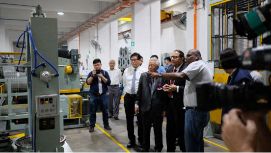 ▲圖3:新加坡貿(mào)易部長(zhǎng)易華仁先生參觀工廠內(nèi)由北方制桶設(shè)備提供的全套鋼桶生產(chǎn)線