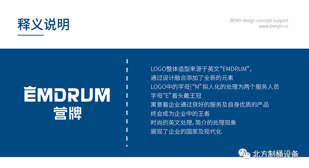 中文名稱“營牌”,logo整體造型來源于品牌的英文名稱“EMDRUM”。通過設(shè)計融合添加了全新的元素,字母“M”擬人化的處理為兩個服務(wù)人員,字母“E”頭戴王冠,寓意著企業(yè)通過良好的服務(wù)及自身優(yōu)質(zhì)的產(chǎn)品繼續(xù)引領(lǐng)行業(yè)發(fā)展,做國際上具有影響力的全套制桶設(shè)備集成供應(yīng)商!琥珀橙和工業(yè)藍的色彩搭配既體現(xiàn)了機械工業(yè)科學(xué)嚴謹之美又增添了現(xiàn)代工藝的活力。